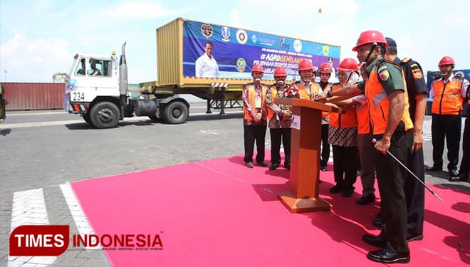TIMES Pontianak/Gubernur Jawa Timur. Dra. Hj. Khofifah Indar Parawansa saat melepas ekspor komoditi pertanian di Terminal PetikEmas Surabaya (TPS). Kamis (21/3/2019). (FOTO: TIM Media For TIMES Indonesia)