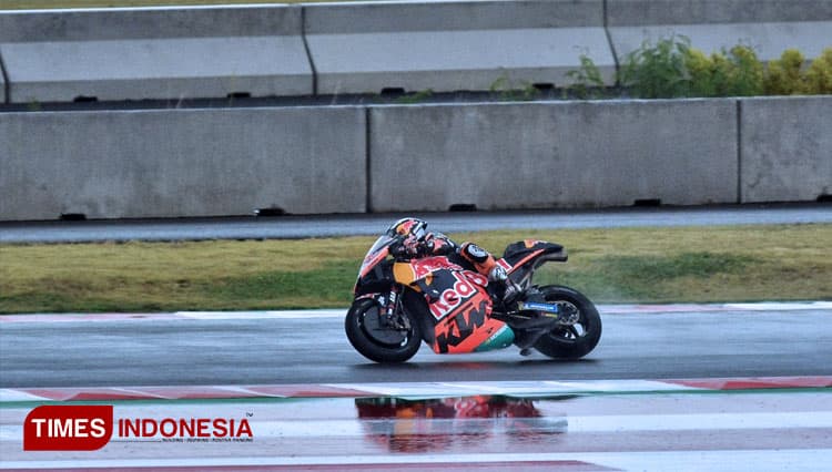 TIMES Pontianak/Pembalap tim Red Bull KTM, Miguel Oliveira melahap trek basah Sirkuit Mandalika, saat lomba seri kedua MotoGP di Mandalika, Lombok, NTB, Minggu (20/3/2022). (FOTO: Tria Adha/TIMES Indonesia)